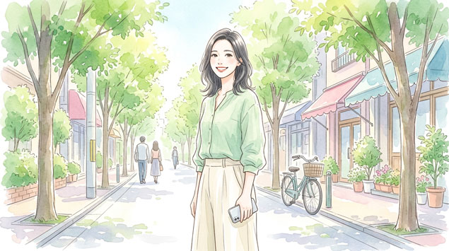 prompt: "A Japanese woman in her late 20s standing on a sunny street with a confident and relaxed smile, holding a smartphone casually in one hand, fresh green trees lining the street in early summer, bright and warm atmosphere, watercolor, hand-drawn, soft touch, pastel colors, illustration by female artist, delicate, gentle, cute, charming, clean-cut appearance, healthy, relaxed, healing, no text, 1200x630, 16:9"