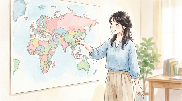 prompt: "A Japanese woman in her late 20s standing near a world map on a wall, pointing to different countries with a curious smile, casual fashion, bright and warm atmosphere, watercolor, hand-drawn, soft touch, pastel colors, illustration by female artist, delicate, gentle, cute, charming, clean-cut appearance, healthy, relaxed, healing, no text, 1200x630, 16:9"