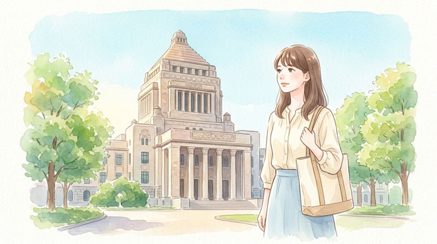 description: 政府機関の建物を背景に立つ20代日本人女性のウォーターカラーイラスト