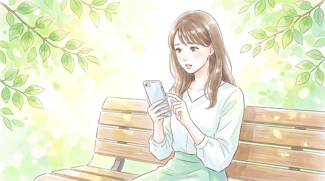 prompt: "A Japanese woman in her late 20s sitting on a park bench, looking at her smartphone with a curious and slightly concerned expression, surrounded by fresh green leaves and soft spring sunlight, bright and warm atmosphere, watercolor, hand-drawn, soft touch, pastel colors, illustration by female artist, delicate, gentle, cute, charming, clean-cut appearance, healthy, relaxed, healing, no text, 1200x630, 16:9"