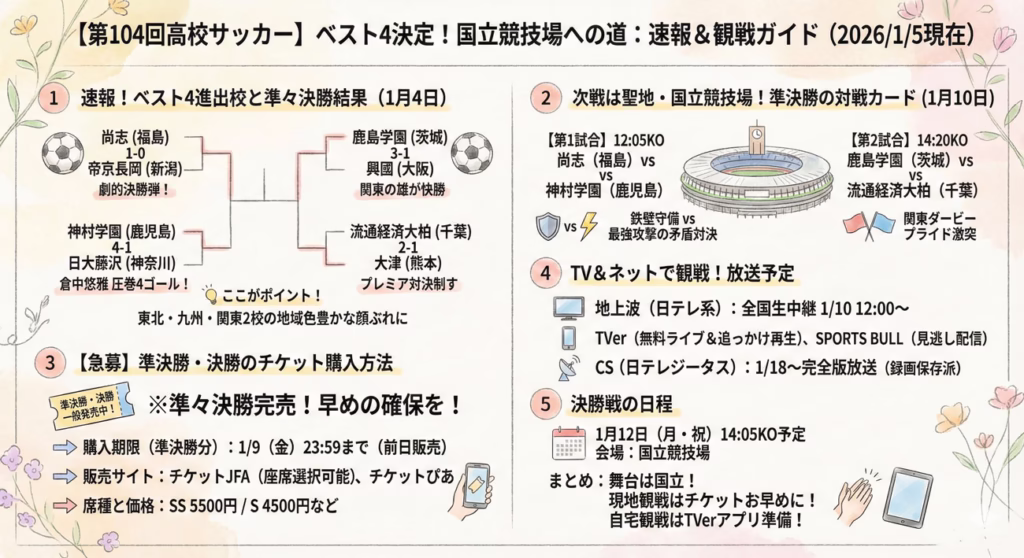 - 第104回高校サッカー選手権、1月4日の準々決勝結果を受けて「ベスト4」が決定。対戦カードと試合内容を速報解説します。