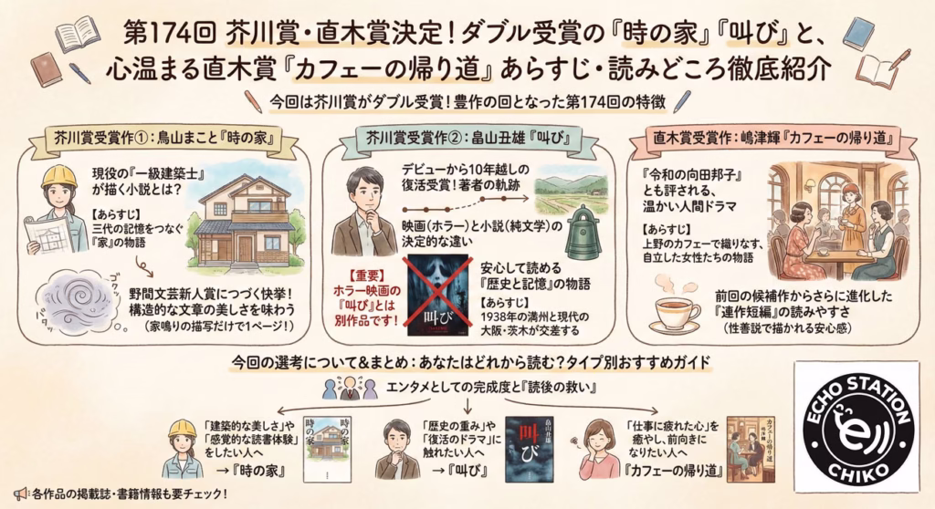 第174回芥川賞・直木賞の結果を、まるでカフェで友人と話しているような距離感で、かつ必要な情報はしっかり網羅できるようにまとめました。読書好きの女性ライターとして、難しい言葉は使わずに、それぞれの作品の魅力をたっぷりとお伝えしますね。