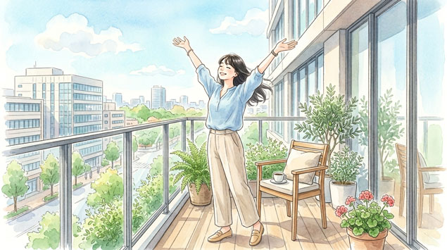 - パソコン作業で目が疲れたら、バルコニーに出て外の空気を吸う。
