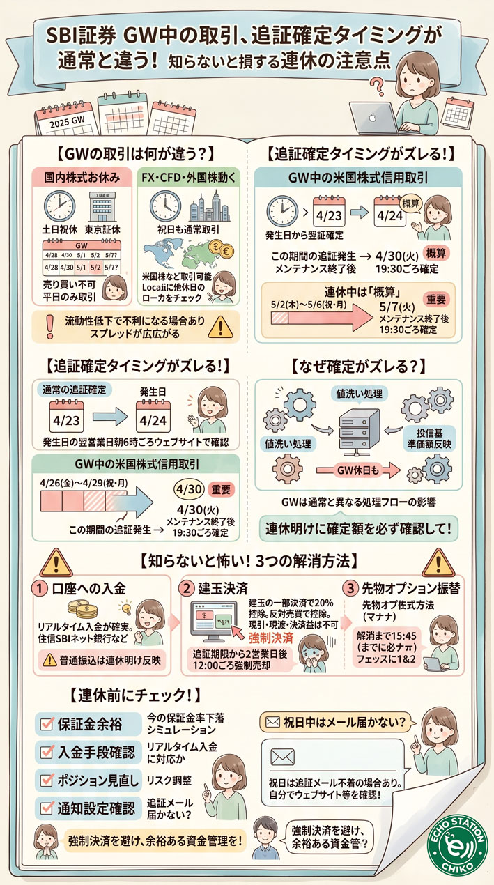 今回は、SBI証券のGW期間中の取引の仕組みと、特に注意したい追証確定タイミングのズレについて、わかりやすくまとめてみるね。