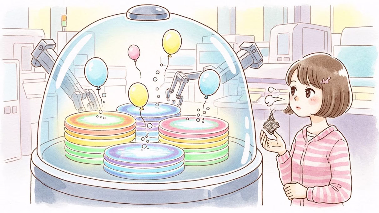 私たちが使っているスマートフォンやパソコンには、写真やアプリを保存するための「3D NAND(ナンド)フラッシュメモリ」という部品が入っています。このメモリは、マンションのように何層にも積み上げて作るのですが、その層を綺麗に作るために絶対に欠かせないのが、このジクロロシランなんです。