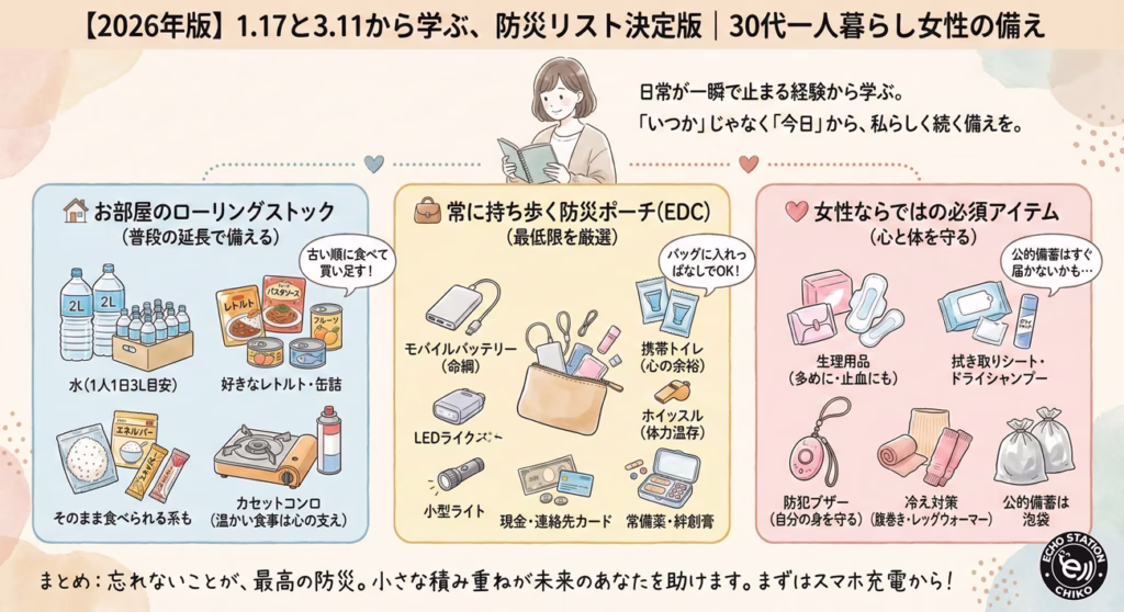 一人暮らしの限られたスペースでも、工夫次第でしっかり備えることはできます。