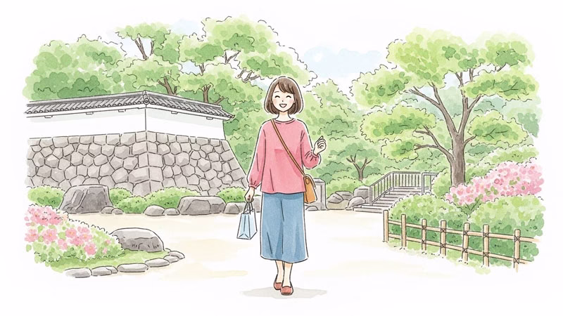 - ルート: 出口を出ると、お堀とお城のような門(大手門)が見えます。そこが入場ゲートです。