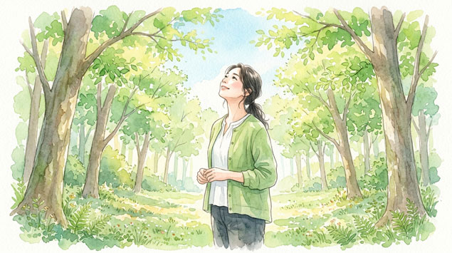 春の山林の入り口に立ち空を見上げる日本人女性のイラスト