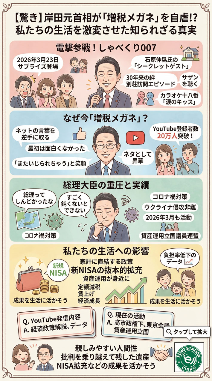 2026年3月23日の夜、日本テレビ系の人気番組『しゃべくり007』に、岸田文雄元首相が突然登場しました 。