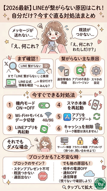 この記事では、LINEが繋がらないときに考えられる原因と、今すぐできる対処法をわかりやすくまとめました。