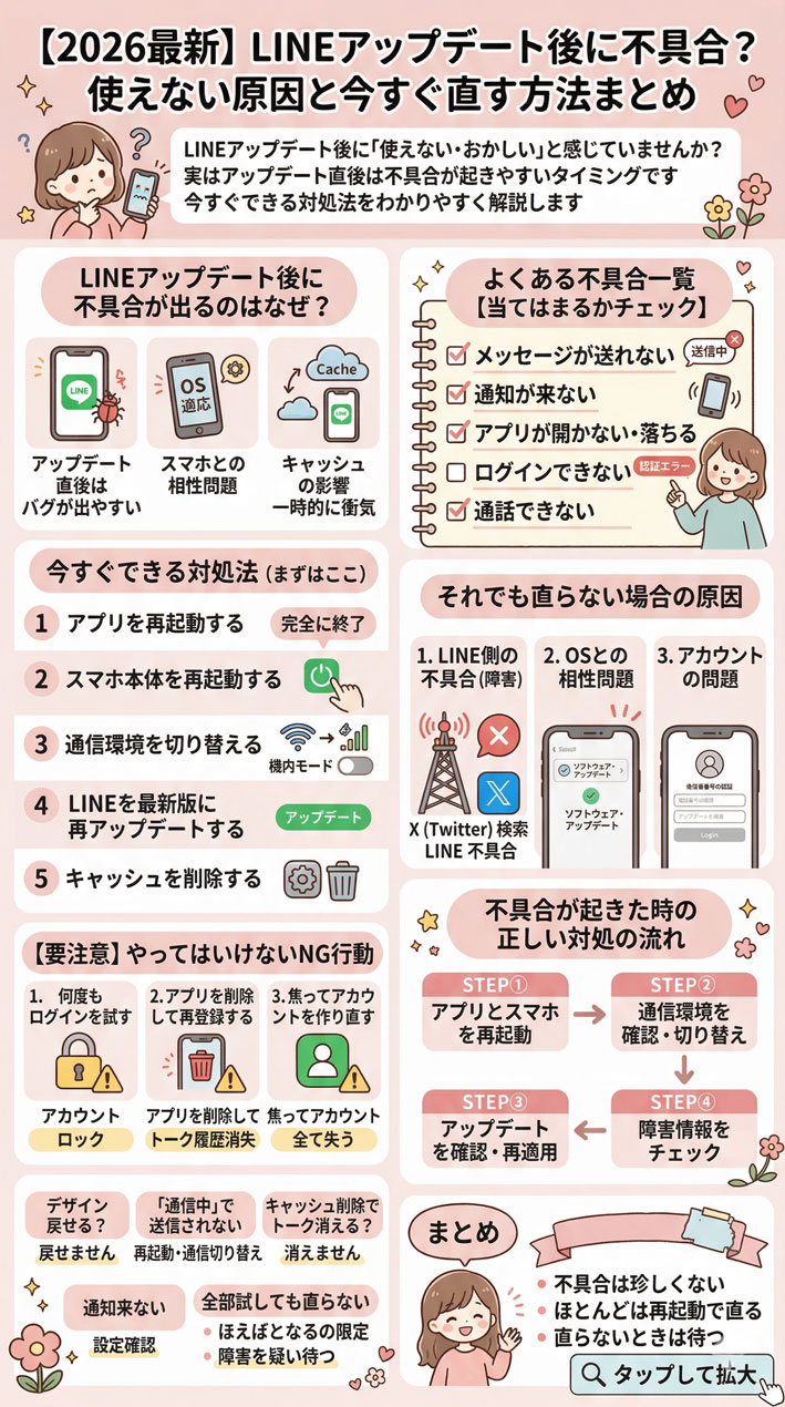 この記事では、LINEをアップデートした後に起きやすい不具合の原因と、今すぐできる対処法を順番にまとめました。