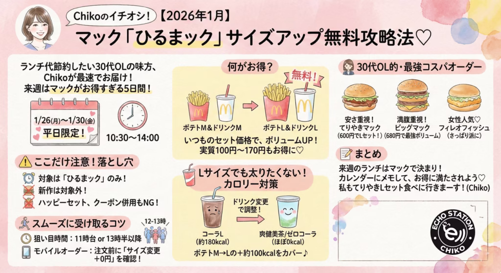 2026年1月26日(月)〜30日(金)の5日間限定で、ひるまックはポテト&ドリンクが“無料でLサイズ”に。