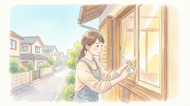 分電盤のカバーの周りや、換気扇のすき間、窓のサッシのわずかなすき間を、テープでしっかりと塞いでいくの。