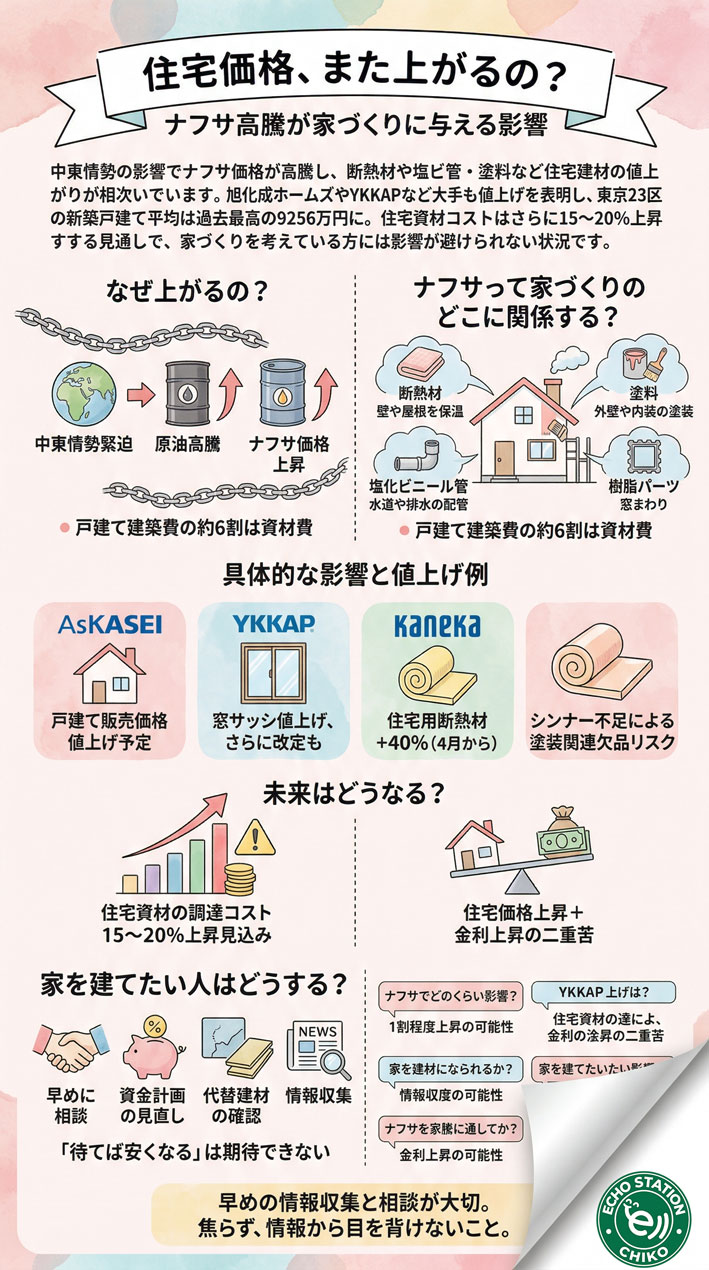- 中東情勢の緊迫化 → 原油高 → ナフサ高 → 建材高 → 住宅価格上昇という連鎖が起きている