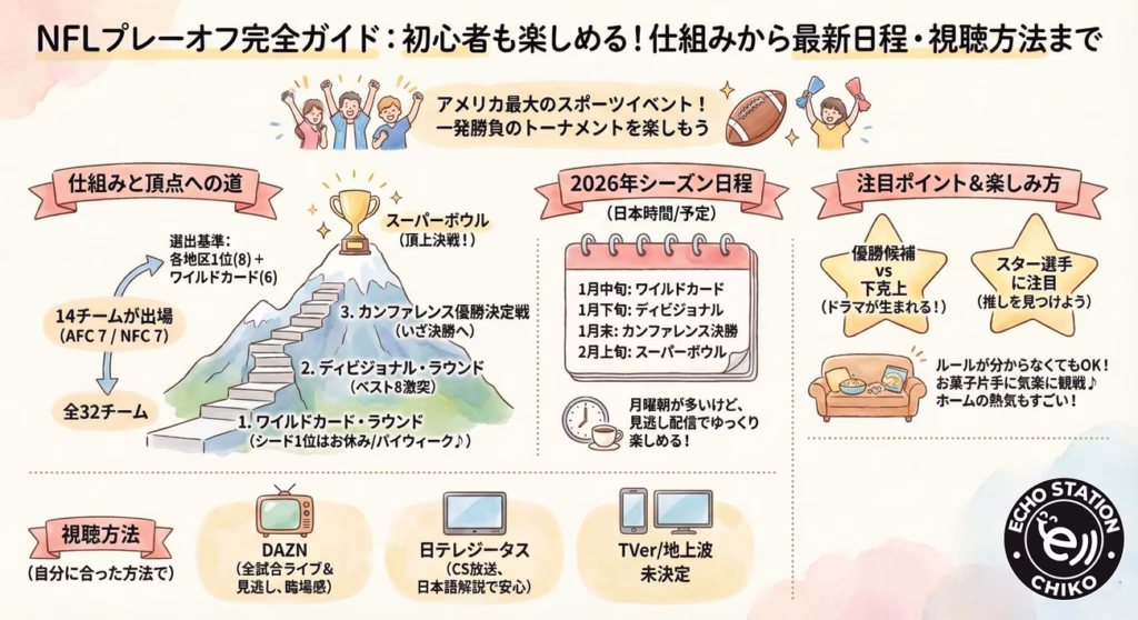 ワイルドカード(2026/1/10〜)からスーパーボウル(2/8)までの最新日程と見どころをまとめました。