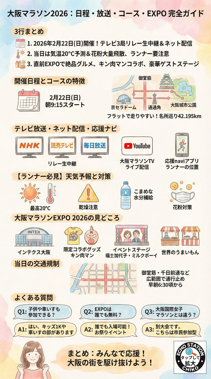大阪の街を舞台にした「大阪マラソン2026」について、日程やコース、そして見どころなどを詳しくご紹介してきました。