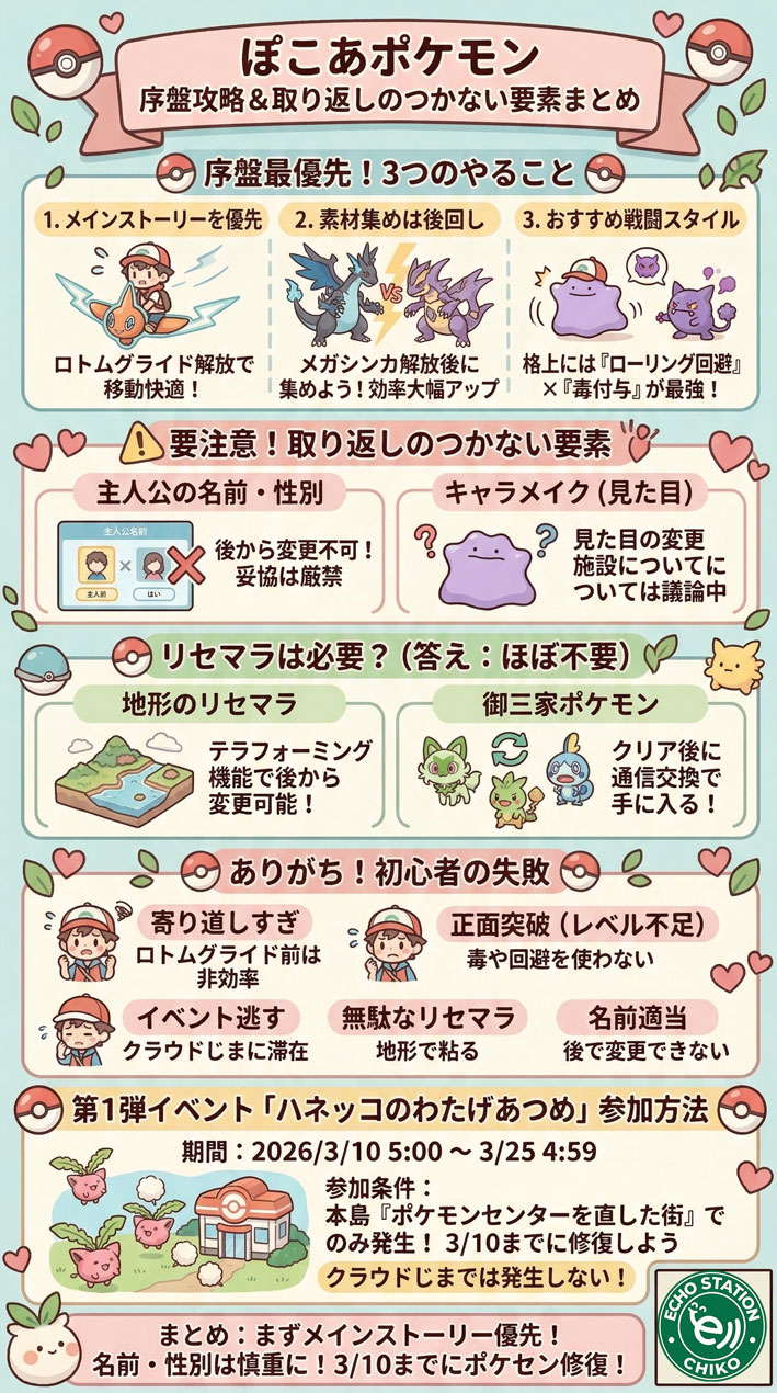 地形やポケモンにこだわって何度もやり直すより、早くゲームを始めてストーリーを楽しむのがおすすめです。