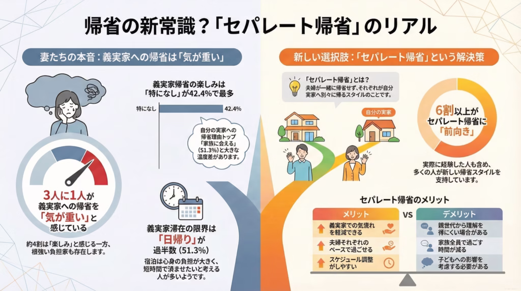 最近注目されている「セパレート帰省」は、夫婦が別々に実家へ帰ることで、お互いのリフレッシュと親孝行を両立させる賢い選択肢です。