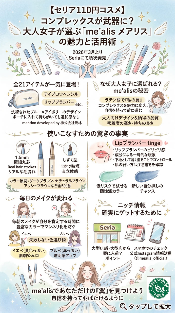 セリアの新作コスメ「mealis(メアリス)」は、110円という驚きの安さで大人の女性の願いを叶えてくれるブランドです。