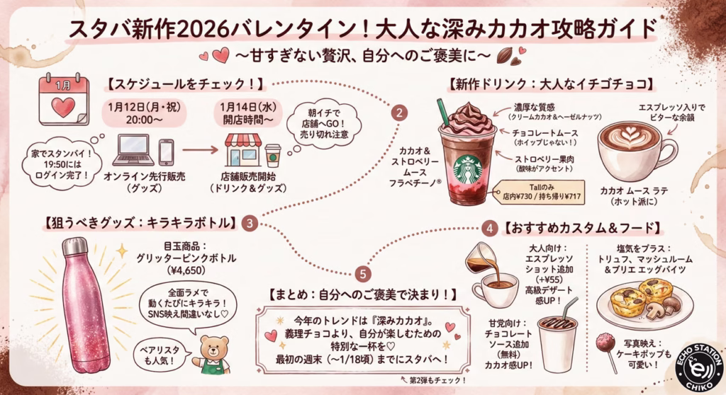 そんな疑問や不安を持っているあなたのために、今回は私がリサーチした情報をぎゅっと凝縮してまとめました。これを読めば、発売日に迷うことなく、最高のバレンタイン・スタバを楽しめるはずです。
