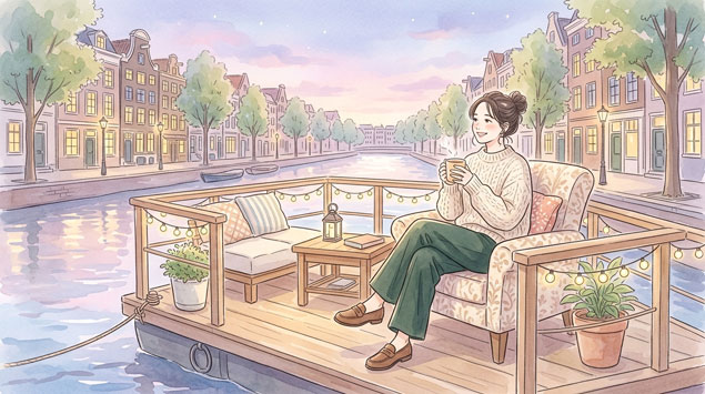 運河の上にぽっかりと浮かんでいるため、周りの通りを歩く人の視線が気になりにくく、とても落ち着いて過ごせるんです。