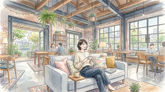 そこに、いまの私たちがもっとリラックスできるような、ゆったりとしたソファやあたたかい照明などが加わるのかもしれません。
