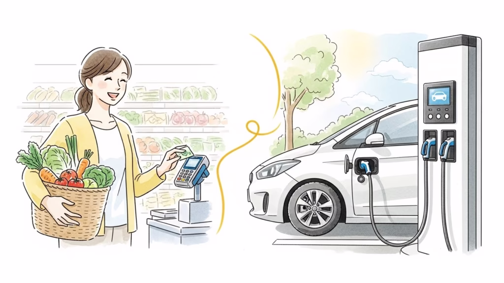 また、電気自動車(EV)やプラグインハイブリッド車(PHEV)にお乗りの方にとっては、充電もポイント源です。