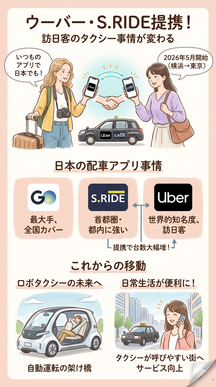 - ウーバーとS.RIDEが提携し、訪日外国人がウーバーアプリで都内タクシーを呼べるようになる(2026年5〜6月予定)