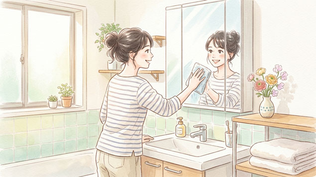 日曜のうちに、鏡・洗面台・浴槽・床のぬめりをサッと拭いておきましょう。 毎日やる必要はなくて、週1回リセットするだけでかなりきれいが保てます。