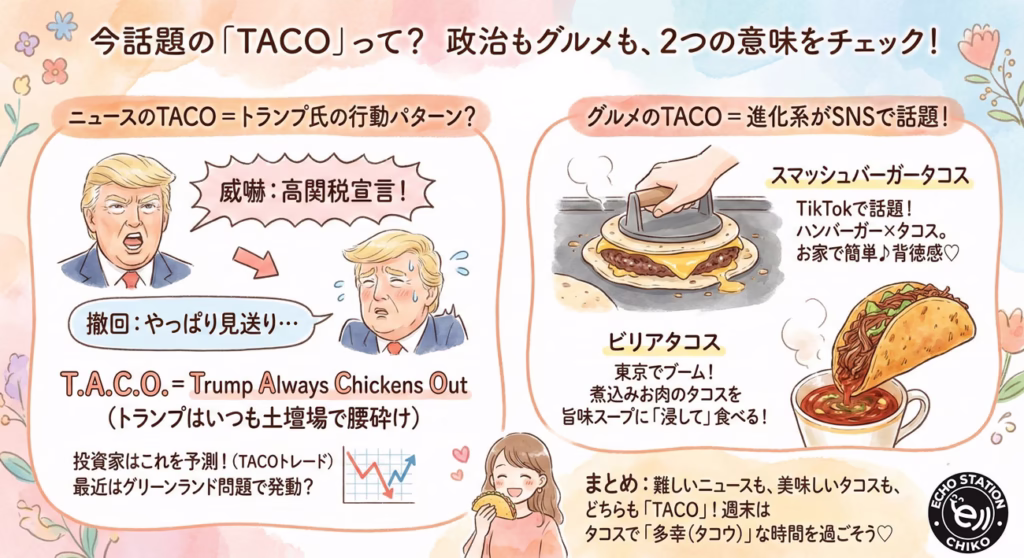 ニュースで「TACO」という言葉を見かけたら、「あ、トランプさんがまた作戦を変えたんだな」と思ってみてくださいね。